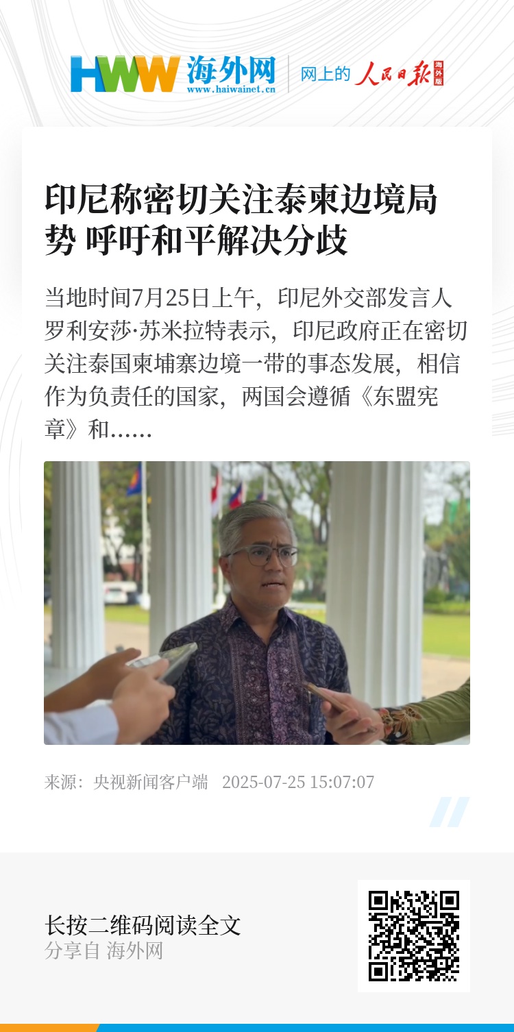 当地时间7月25日上午,印尼外交部发言人罗利安莎·苏米拉特表示,印尼政府正在密切关注泰国柬埔寨边境一带的事态发展,相信作为负责任的国家,两国会遵循《东盟宪章》和《友好合作条约》原则,用和平手段解决分歧,维护东盟成员国间的友谊与合作精神。