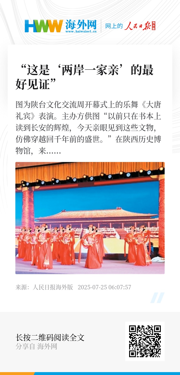 “这次来陕,我欣赏了乐舞《大唐礼宾》、台湾少数民族歌舞《泛札莱》,还观看了纪录片《血脉——从台南到陕北》,深切感受到两岸同根同源、同文同种,共同守护、传承、弘扬中华优秀传统文化是我们的共同责任。”台湾两岸经贸文化农特产协会理事长陈德维说。