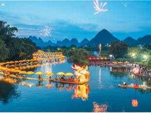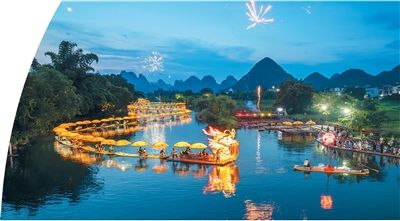 广西壮族自治区桂林市阳朔县白沙镇遇龙桥畔,“金龙巡游”精彩上演。