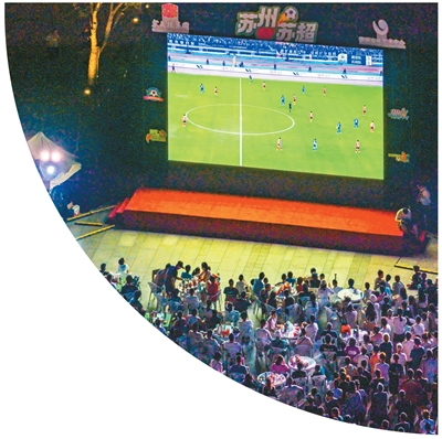 在江苏省苏州市,市民在晚间来到金鸡湖畔观看“苏超”比赛。