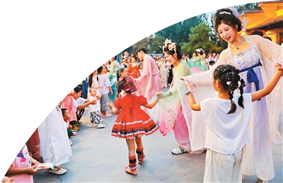 在河北省秦皇岛市海港区,游客夜游秦皇小巷,与演员共同跳舞。