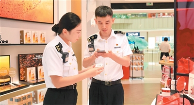 海口海关所属三亚海关关员在三亚国际免税城抽查海南离岛免税商品专属溯源码。