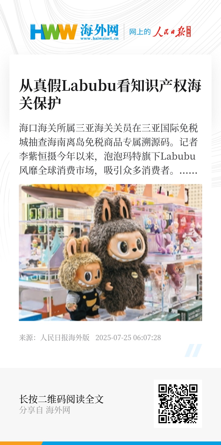 今年以来,凭借着可爱的外表和丰富的搭配性,中国潮玩Labubu吸引了众多海外粉丝。随之而来的,是部分假冒伪劣产品接连出现。海关总署公众号为此连续发布《海关大战假布布》,引起人们关注,并让更多人知道了知识产权海关保护这一海关职责。