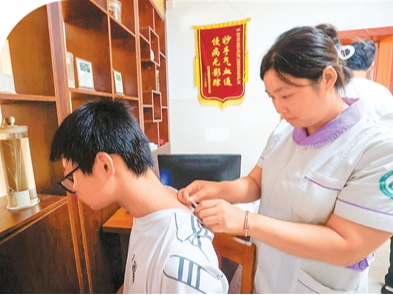 7月22日,江西省九江市湖口县中医医院的医护人员正在为市民提供“三伏贴”敷贴服务。