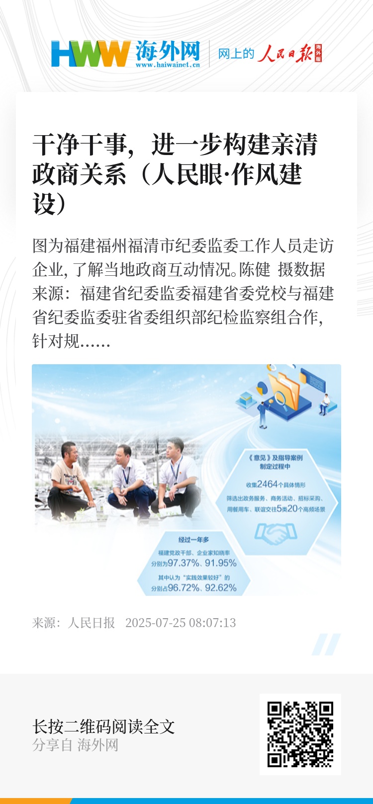 经过一年多实践,福建省纪委监委调研数据显示,对《意见》及指导案例,党政干部、企业家知晓率分别为97.37%、91.95%,其中认为“实践效果较好”的分别占96.72%、92.62%。