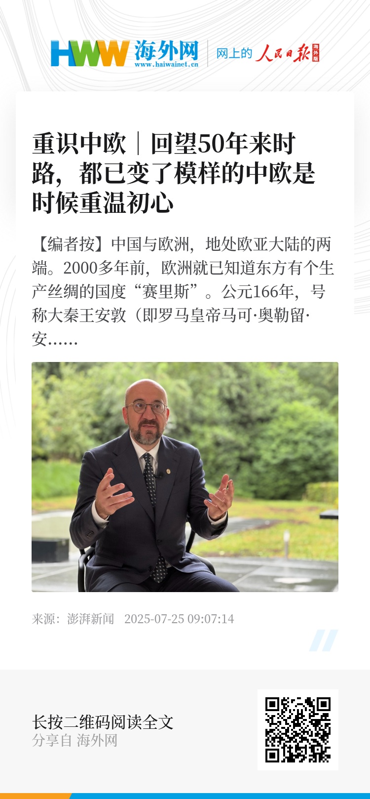 这段跨越半世纪的相遇不仅创造了双方经济总量占全球三分之一的经济共生格局,更在气候变化、人工智能等人类共同挑战面前,展现出“和而不同”的文明智慧。与此同时,经历了50年沧海桑田,中欧都已非复旧时“模样”,对彼此的认知也在不断调整变化中。然而,中欧在当下的历史节点上要“凝聚共识、超越分歧”,或许要重新回顾50年前“最初的合作基础”。