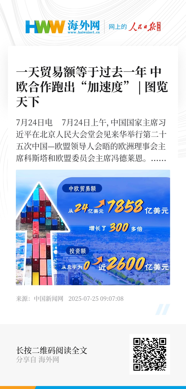 2025年是中国欧盟建交50周年。回望半个世纪的风雨兼程,中欧关系从刺穿冷战阴云的“破冰者”发展成为经济全球化合作的“引领者”,从试探性的握手,发展为世界经济增长的“双引擎”。