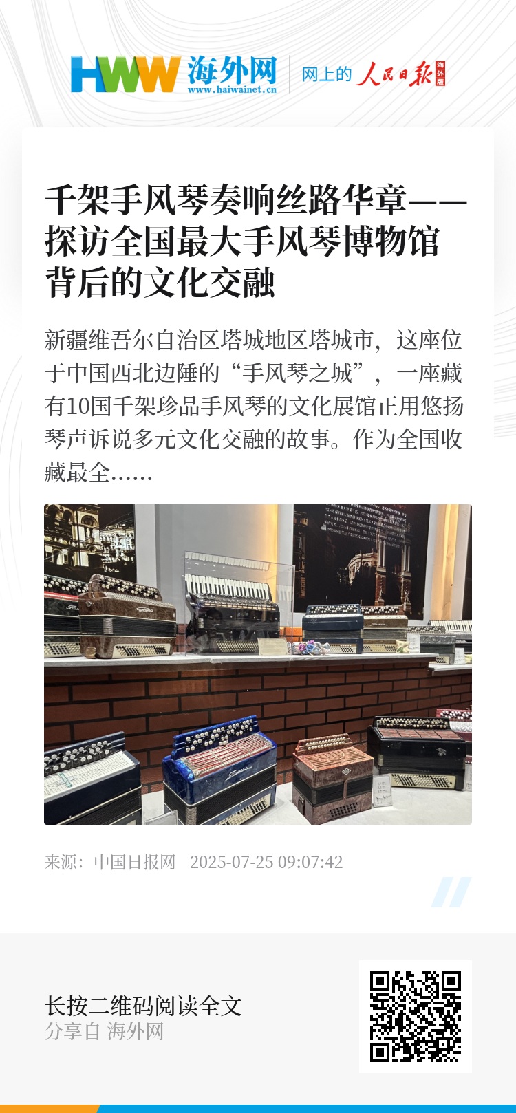 展馆中,修复完好的前苏联时期手风琴仍可奏响《喀秋莎》,而新疆本土改良的琴键则印着维吾尔族花纹。这座边境小城的博物馆不断接待着来自世界各国的访客,其珍藏的20世纪苏联制“儿童迷你琴”等稀有展品,连专业研究者都慕名而来。塔城用琴声搭建的跨文明对话平台,展现了中国文化的包容与开放。“当俄罗斯民歌和哈萨克族舞曲在同一架琴上响起时,文化的边界就消失了。”一位参观者在留言簿上写道。