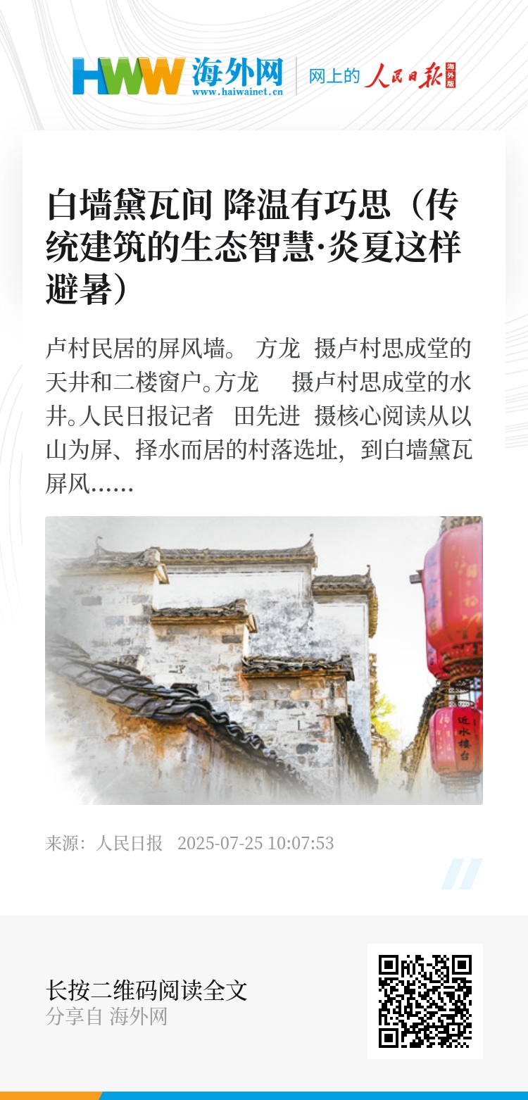 从以山为屏、择水而居的村落选址,到白墙黛瓦屏风墙的建筑特色,炎炎夏日,徽州传统民居凭借建造巧思,在避暑方面发挥较大作用,也为现代绿色建筑提供了设计灵感。