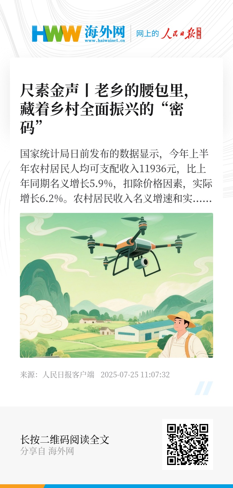 今年上半年农民收入数据中还有一个值得关注,就是城乡居民人均可支配收入之比由上年同期的2.45降至2.42。城乡融合发展,要持续缩小城乡居民收入差距,关键在于持续提高农村居民收入。推动农民收入持续稳定增长,不仅有助于促进共同富裕,也有助于畅通城乡经济循环。