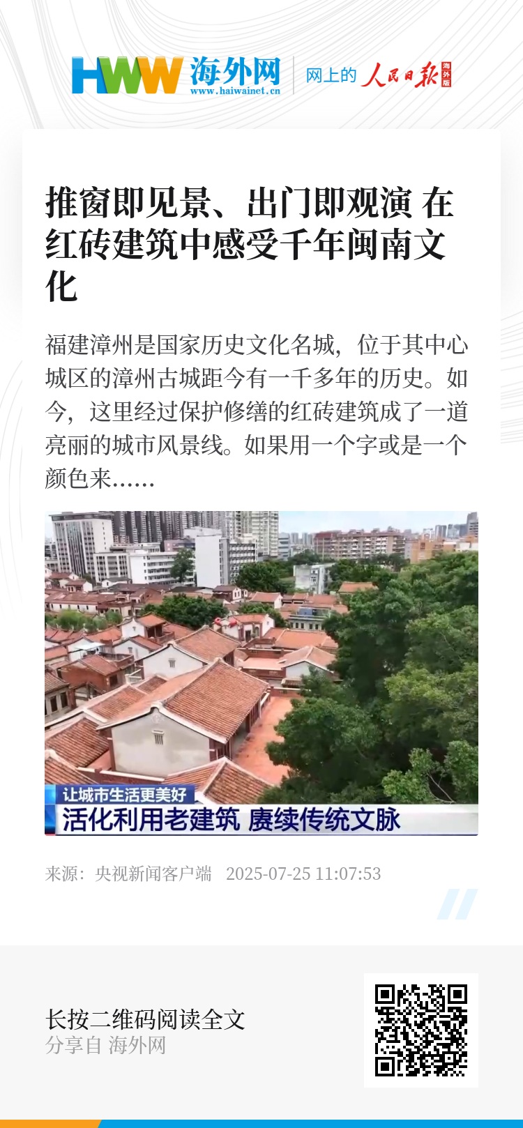 福建漳州是国家历史文化名城,位于其中心城区的漳州古城距今有一千多年的历史。如今,这里经过保护修缮的红砖建筑成了一道亮丽的城市风景线。