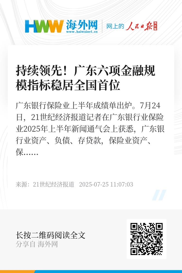 7月24日,21世纪经济报道记者在广东银行业保险业2025年上半年新闻通气会上获悉,广东银行业资产、负债、存贷款,保险业资产、保费收入和承保利润等规模指标持续稳居全国第一,为广东经济增长提供充足的融资支持和风险保障。
