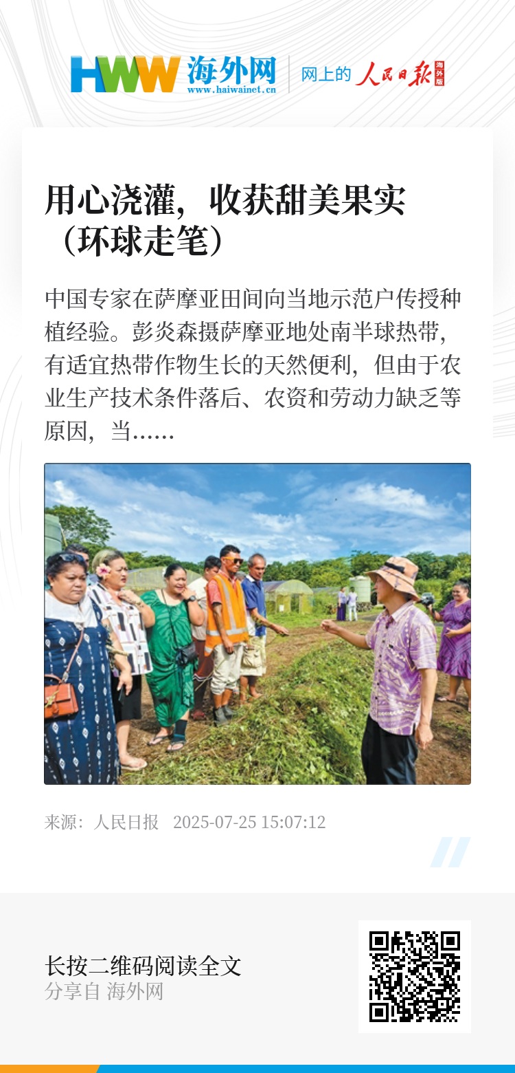 今年是我参加中国农业援外工作的第七年。从尼日利亚高温炙烤的田野,到埃塞俄比亚疫情肆虐的阴霾,再到闷热潮湿的萨摩亚乡间,我和同事们坚守岗位、播种希望,亲历并见证着中国农业对外援助取得的丰硕成果和铺就的友谊之路。正所谓一分耕耘一分收获,农业援外工作虽然艰苦,但所到之处,当地人民饱含感激和热情的笑脸,就是对我们付出的最好回报。用心浇灌,收获的是最甜美的果实。(谢俊华)