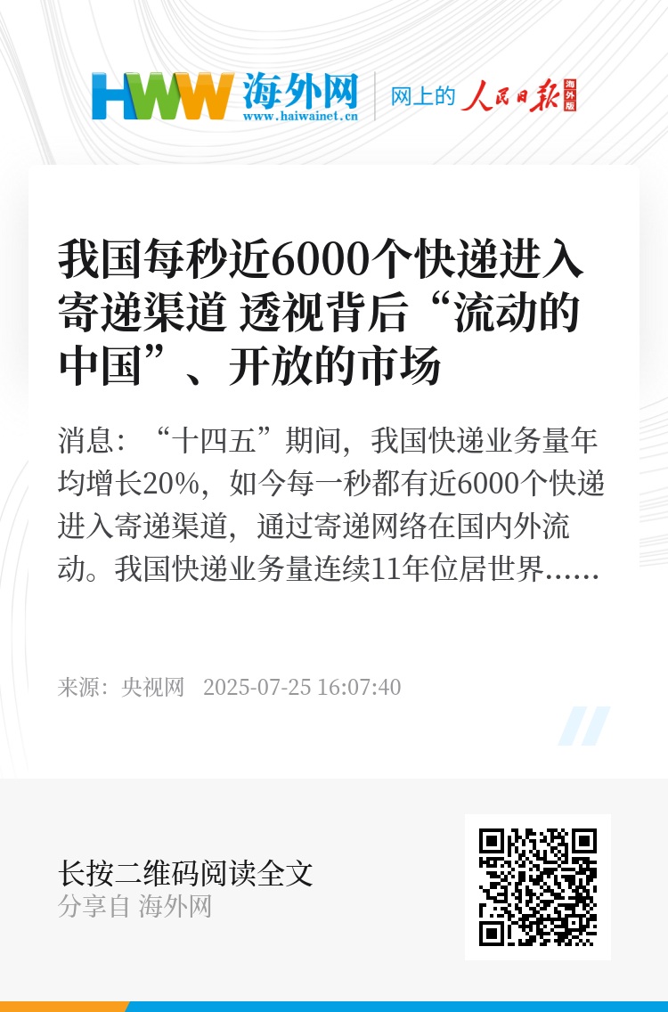 央视网消息:“十四五”期间,我国快递业务量年均增长20%,如今每一秒都有近6000个快递进入寄递渠道,通过寄递网络在国内外流动。