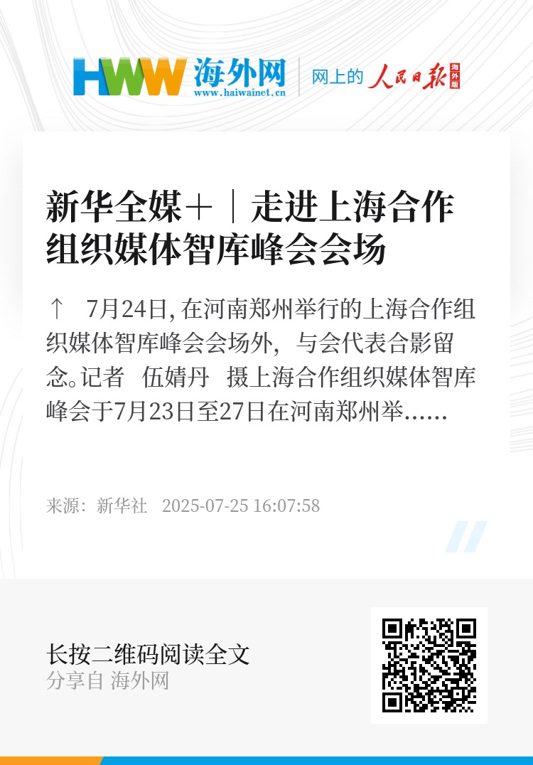 上海合作组织媒体智库峰会于7月23日至27日在河南郑州举行。峰会主题为“弘扬‘上海精神’,共建美好家园”。来自上海合作组织26个国家的156家主流媒体、知名智库、政府机构以及联合国、上海合作组织秘书处等国际和地区组织的400多名代表参会。