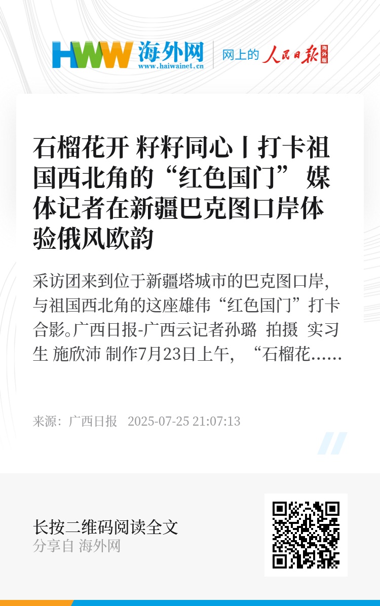 7月23日上午,“石榴花开 籽籽同心”铸牢中华民族共同体意识网络主题活动采访团一行来到位于新疆塔城市的巴克图口岸,绿树掩映红墙,独特的建筑体现出浓郁的俄风欧韵和民族文化元素,媒体记者们也忍不住与祖国西北角的这座雄伟“红色国门”打卡合影,感受草原丝路上的繁华商贸。