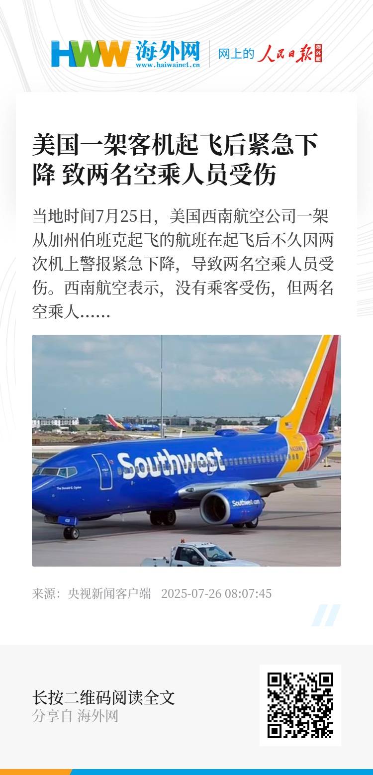 当地时间7月25日,美国西南航空公司一架从加州伯班克起飞的航班在起飞后不久因两次机上警报紧急下降,导致两名空乘人员受伤。