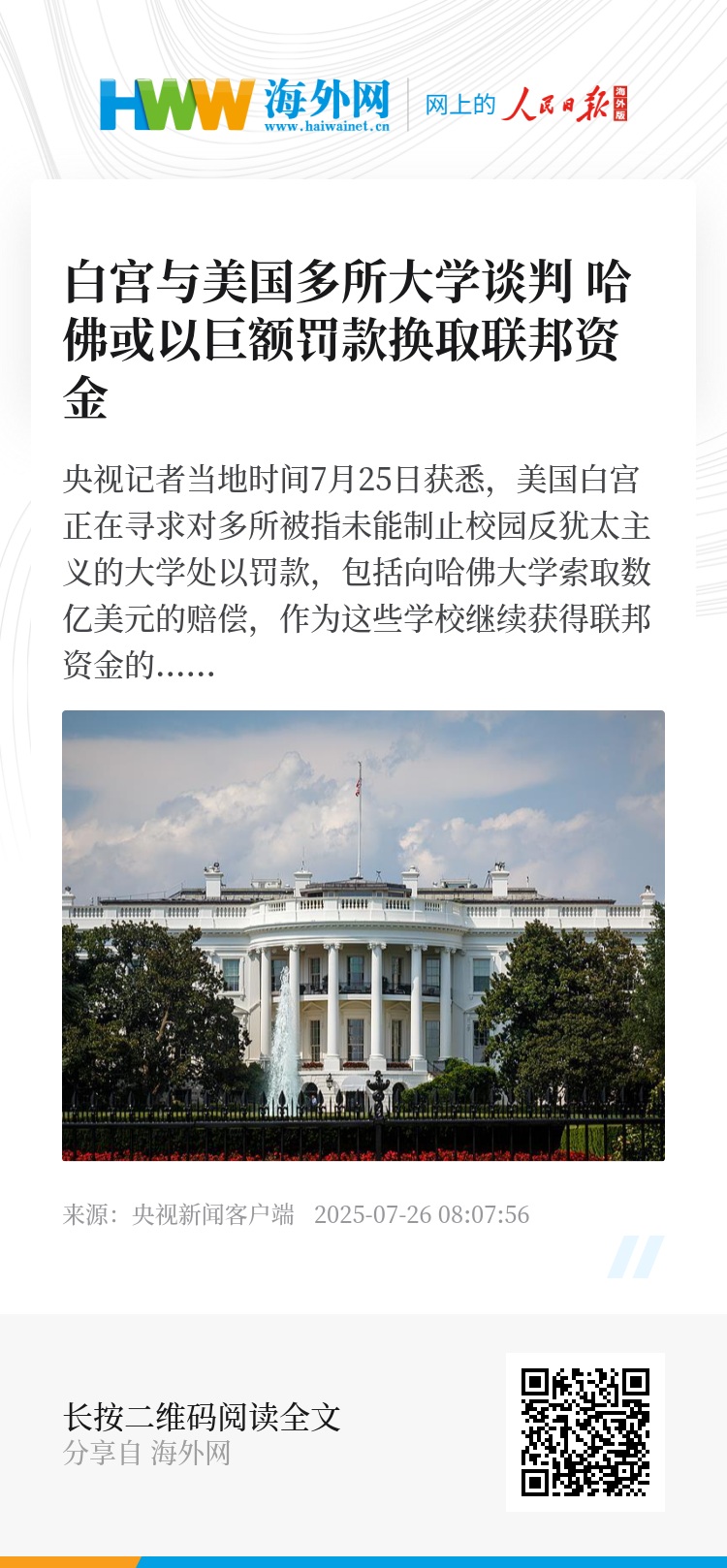 特朗普政府正与多所被指反犹太主义的大学就联邦资金问题进行谈判,在与哥伦比亚大学达成协议后,要求包括哈佛大学在内的其他大学支付罚款。(央视记者 曹健)