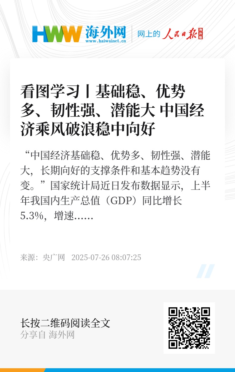 国家统计局近日发布数据显示,上半年我国内生产总值(GDP)同比增长5.3%,增速比去年同期和全年均提升0.3个百分点。面对复杂严峻的国际形势,中国经济顶住压力、迎难而上,经济运行总体平稳、稳中向好。