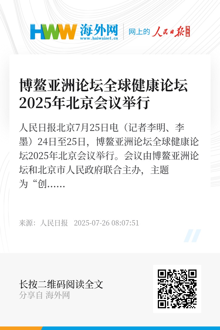人民日报北京7月25日电(记者李明、李墨)24日至25日,博鳌亚洲论坛全球健康论坛2025年北京会议举行。会议由博鳌亚洲论坛和北京市人民政府联合主办,主题为“创新驱动下的健康产业新未来”。来自34个国家和地区的政府官员、国际组织负责人、企业家、学者、驻华使节及中外媒体代表等共300余人出席大会。