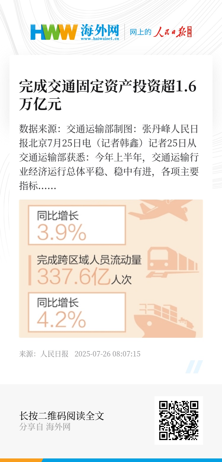 人民日报北京7月25日电(记者韩鑫)记者25日从交通运输部获悉:今年上半年,交通运输行业经济运行总体平稳、稳中有进,各项主要指标保持增长。