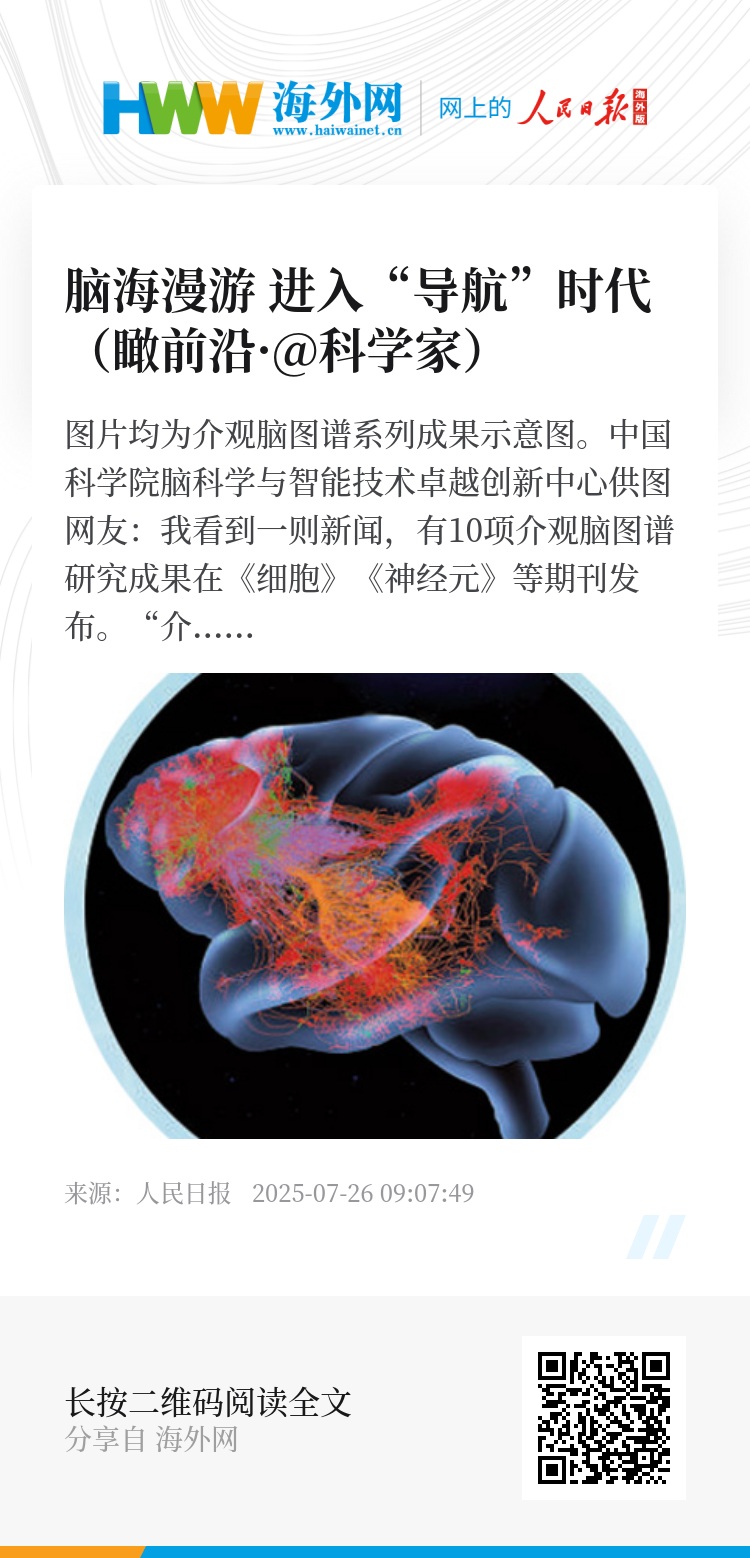 编辑:您关注到的,是由中国科学院脑科学与智能技术卓越创新中心发起的“全脑介观神经联接图谱”大科学计划的研究成果。据介绍,国内外300多位科学家利用我国自主研发的高精度光学脑成像等技术,历时5年绘制出多张介观脑图谱,覆盖了爬行类、鸟类、啮齿类、非人灵长类和人类等关键物种,相当于为大脑绘制了前所未有的“星系分布图”。