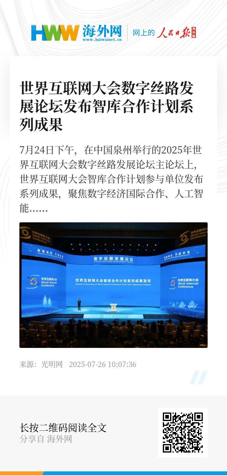 7月24日下午,在中国泉州举行的2025年世界互联网大会数字丝路发展论坛主论坛上,世界互联网大会智库合作计划参与单位发布系列成果,聚焦数字经济国际合作、人工智能助力数字丝绸之路发展、人形机器人以及数字经济反垄断等领域,服务“一带一路”高质量发展新阶段,为数字丝绸之路建设提供战略洞见。