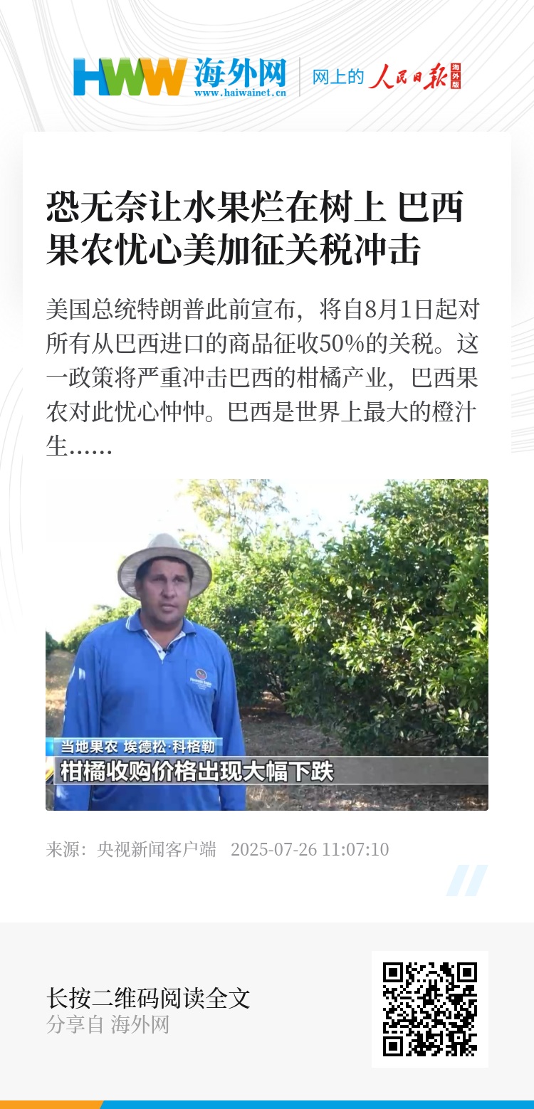 美国总统特朗普此前宣布,将自8月1日起对所有从巴西进口的商品征收50%的关税。这一政策将严重冲击巴西的柑橘产业,巴西果农对此忧心忡忡。