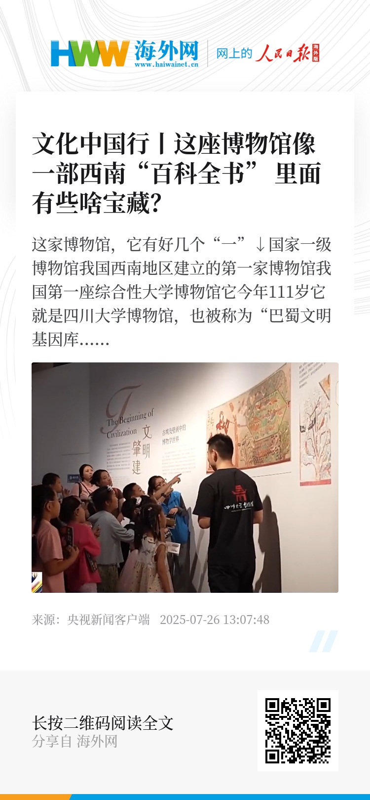 总台央视记者 李晶晶:走进这座西南地区历史最悠久的博物馆,就像打开了一部西南的“百科全书”。八万多件特色文物、百万件珍稀动植物标本,从自然科学到历史考古,再到丰富多彩的民俗民族文化,它生动讲述着这片土地上的故事,带我们读懂何谓巴蜀,何谓天府。