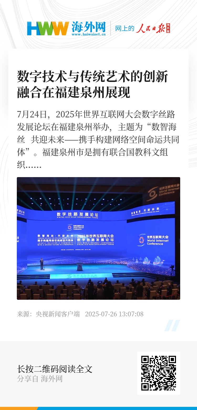 7月24日,2025年世界互联网大会数字丝路发展论坛在福建泉州举办,主题为“数智海丝 共迎未来——携手构建网络空间命运共同体”。