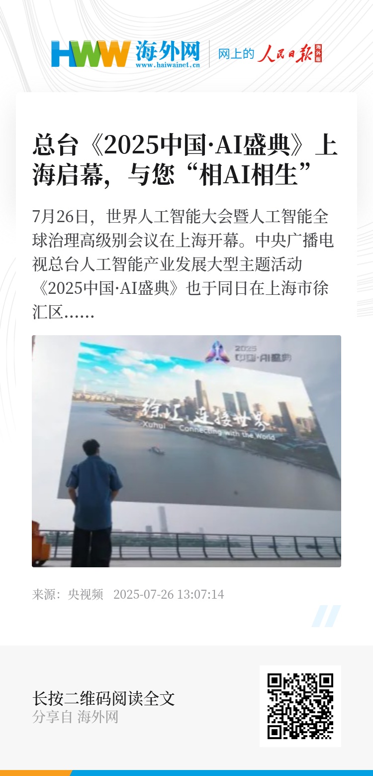 AI在上海,相AI相生。在这里,AI不仅驱动着千行百业的转型升级,更悄然浸润进千家万户的日常点滴,让每一位城市居民都能在科技之光中,过得越来越“适意”!总台《2025中国·AI盛典》将于8月中旬在总台央视综合频道(CCTV-1)、央视频新媒体矩阵播出,与您“相AI相生”,在上海共赴未来!