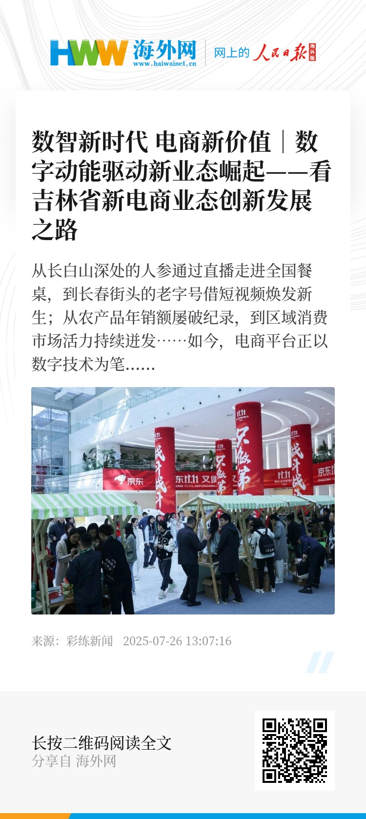 从长白山深处的人参通过直播走进全国餐桌,到长春街头的老字号借短视频焕发新生;从农产品年销额屡破纪录,到区域消费市场活力持续迸发……如今,电商平台正以数字技术为笔、市场网络为墨,深度融入吉林经济社会发展肌理,成为撬动产业升级与消费提振的核心引擎。