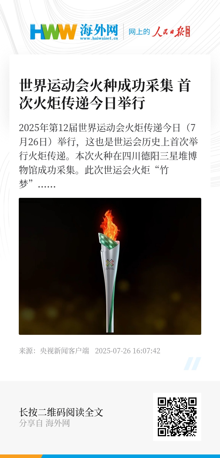 2025年第12届世界运动会火炬传递今日(7月26日)举行,这也是世运会历史上首次举行火炬传递。本次火种在四川德阳三星堆博物馆成功采集。