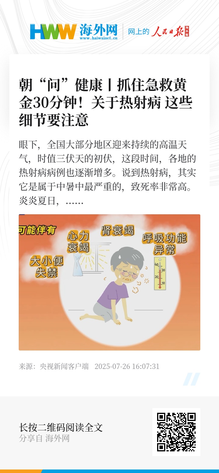 专家介绍,热射病的发病机制就是体温调节失衡,引发多器官损伤甚至死亡。一旦发现疑似热射病患者,必须立即降温,这样做可以大幅降低死亡的风险。