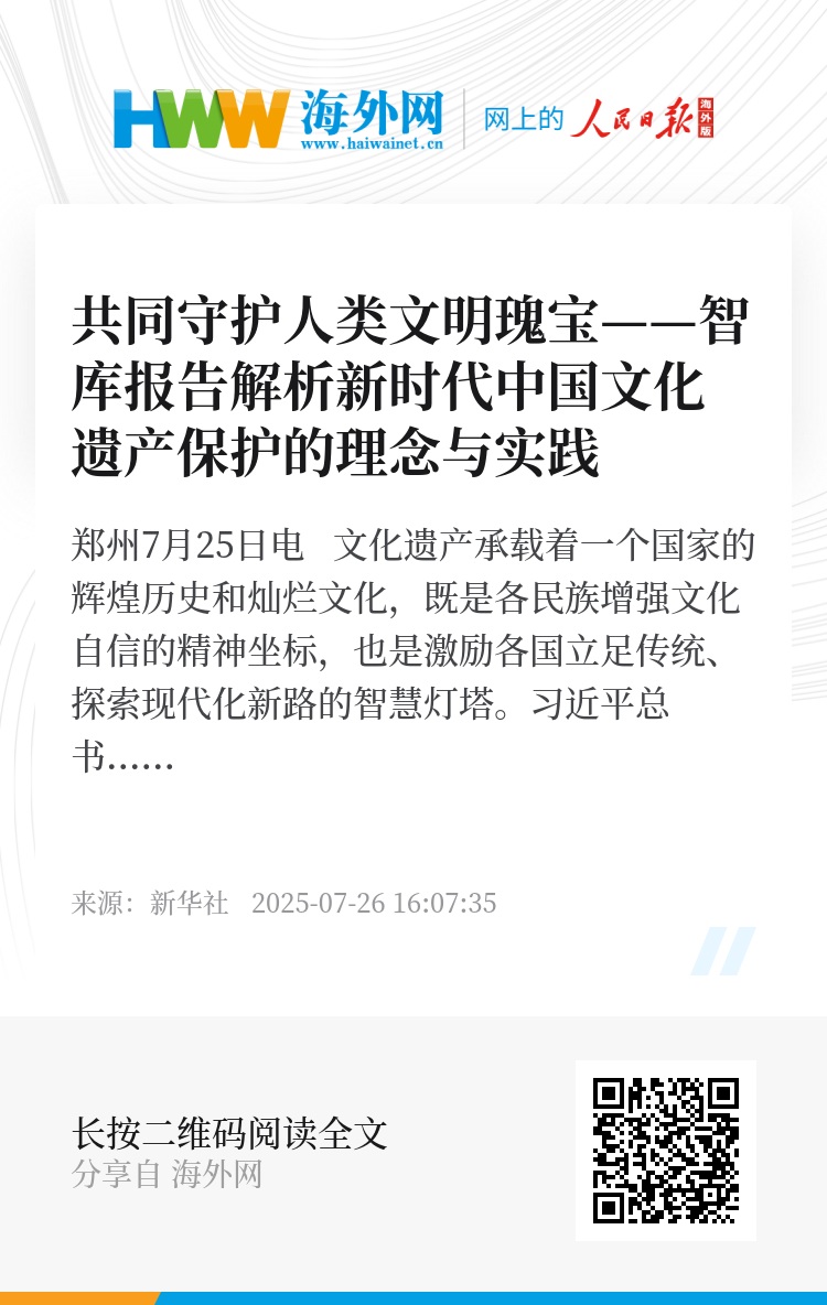 7月25日,新华社国家高端智库在河南郑州举办的上海合作组织媒体智库峰会上发布《共同守护人类文明瑰宝——新时代中国文化遗产保护的理念与实践》智库报告。报告认为,守护文化遗产,既是向历史致敬,更是对未来的承诺。中华文明历来赞赏不同文明间的相互理解和尊重,中国以负责任态度参与文化遗产领域全球治理。各国携手以敬畏之心守护人类共同的文化遗产,以博大胸襟维护世界文明多样性,必将促进各国人民相知相亲,推动文明交流互鉴、美美与共。