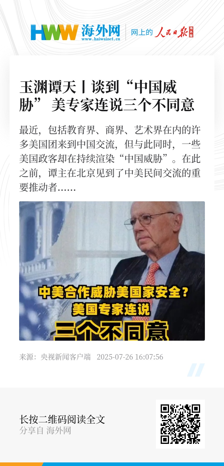 最近,包括教育界、商界、艺术界在内的许多美国团来到中国交流,但与此同时,一些美国政客却在持续渲染“中国威胁”。在此之前,谭主在北京见到了中美民间交流的重要推动者——美中关系全国委员会会长欧伦斯。作为中美建交的参与者、中美关系领域的关键人物,面对这样的反差,他是怎么看待的? 来看视频↓