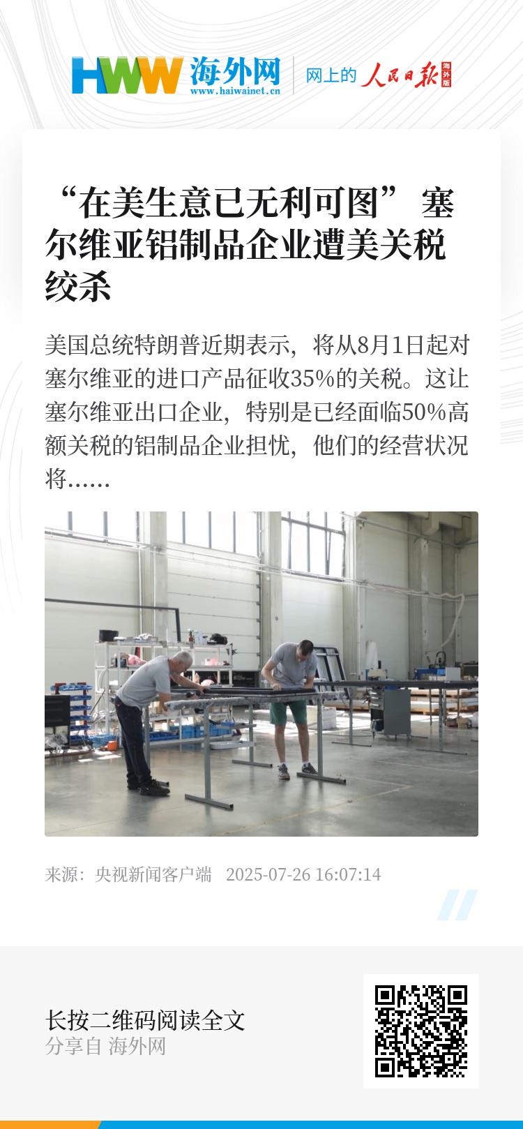 美国总统特朗普近期表示,将从8月1日起对塞尔维亚的进口产品征收35%的关税。这让塞尔维亚出口企业,特别是已经面临50%高额关税的铝制品企业担忧,他们的经营状况将雪上加霜。当地时间25日,总台记者走访了塞尔维亚最大的铝合金门窗生产和出口企业。