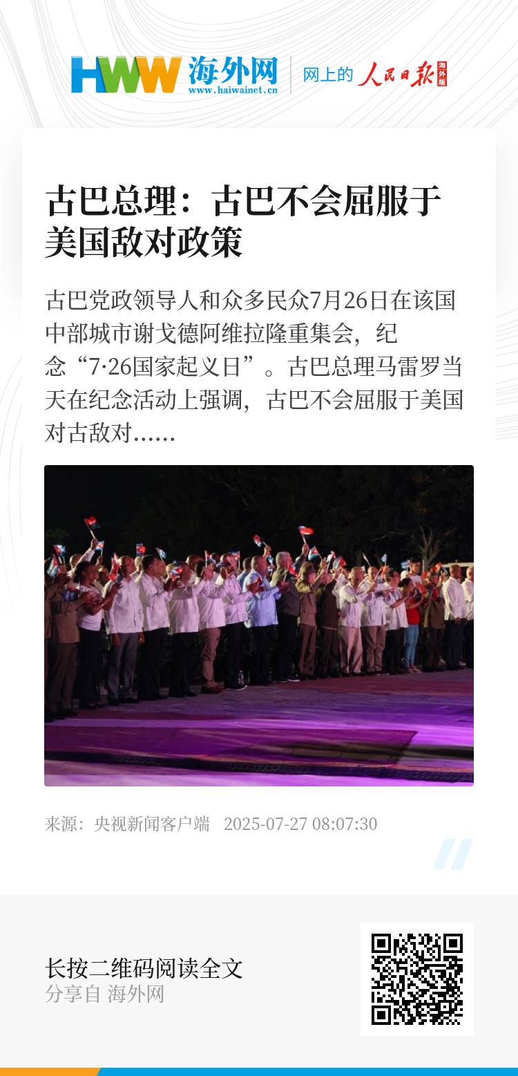 古巴总理马雷罗当天在纪念活动上强调,古巴不会屈服于美国对古敌对政策,将战胜重重困难,不惜一切代价捍卫国家尊严。