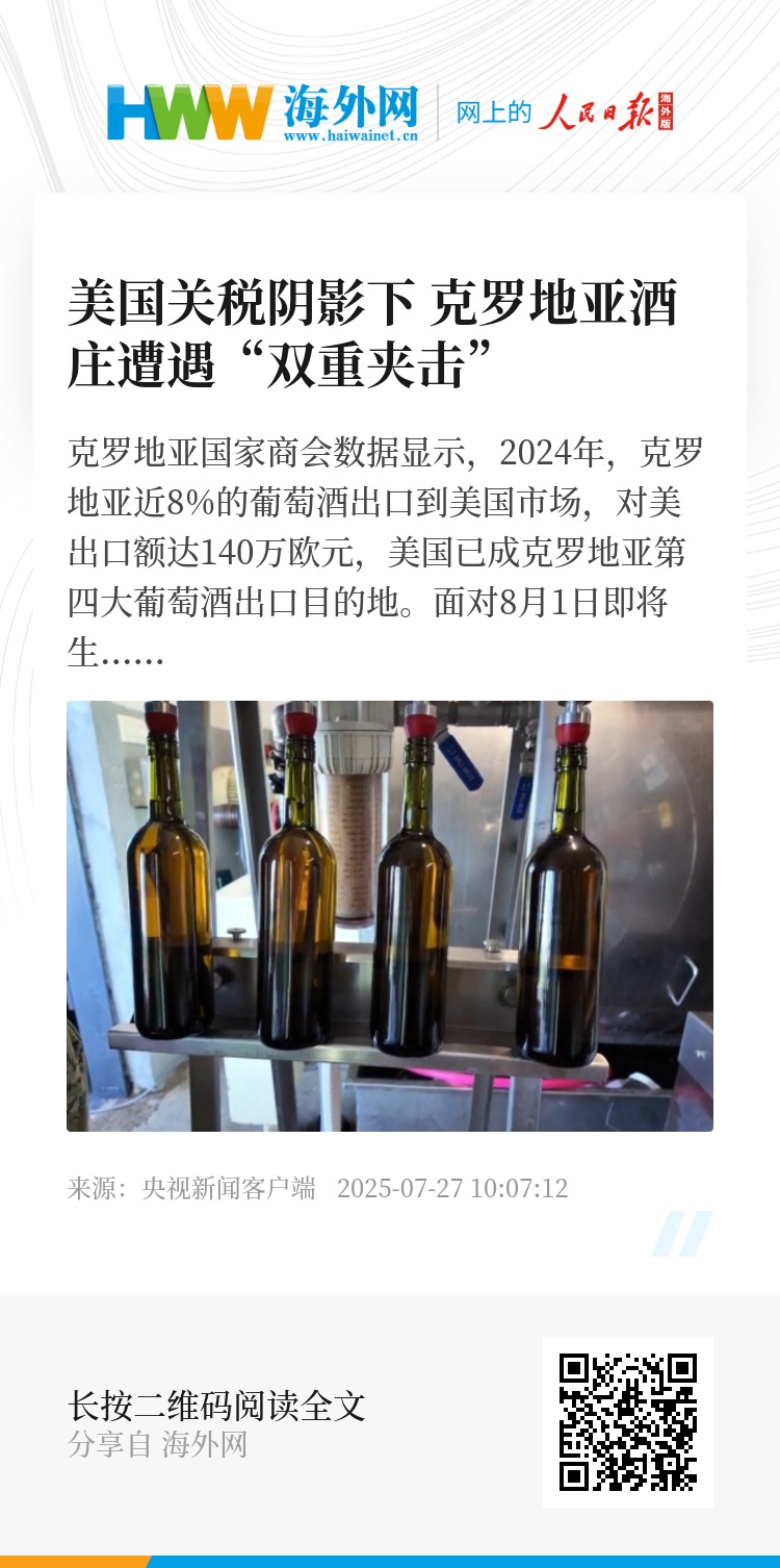 面对8月1日即将生效的美国对欧盟商品加征30%的关税,克罗地亚的葡萄酒商倍感压力。