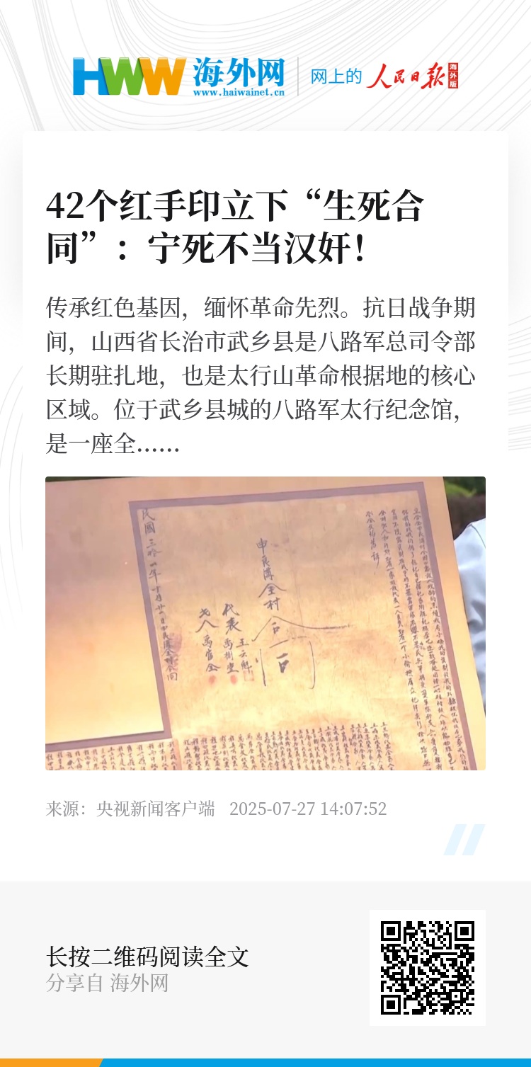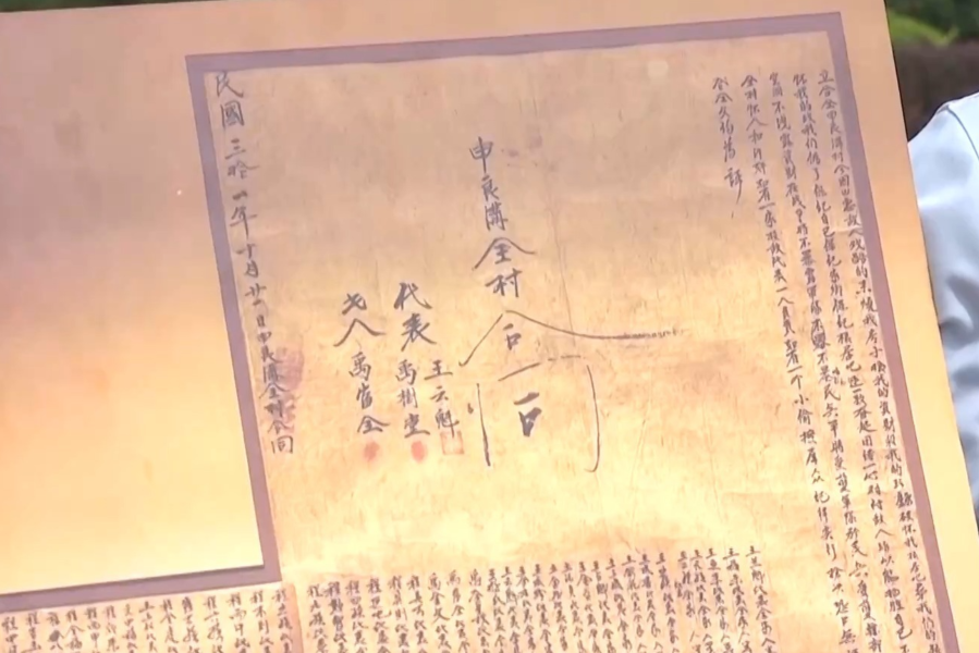 1942年,日军频繁扫荡太行抗日根据地,敌后抗战进入了极度艰难的阶段,在这样的背景下,申良沟的村民代表聚到了一起签下了这份合同,合同中写道,“能牺牲生命,不暴露军队、不暴露资财”“宁死不当汉奸”,最终全村42户村民代表都在这份合同上按下了红指印。这张薄薄的纸片,承载着抗日军民鱼水情深的情感和与敌人斗争到底的信念。