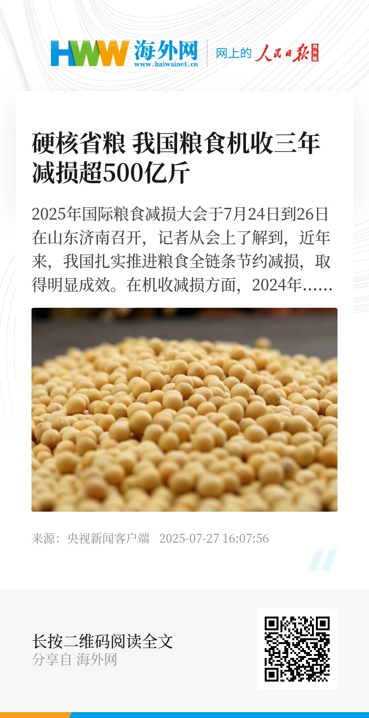 在机收减损方面,2024年我国小麦、水稻、玉米三大主粮机收损失率分别为0.93%、1.76%和2.06%,比2021年降低1到2个百分点,3年共减少粮食损失500亿斤以上。