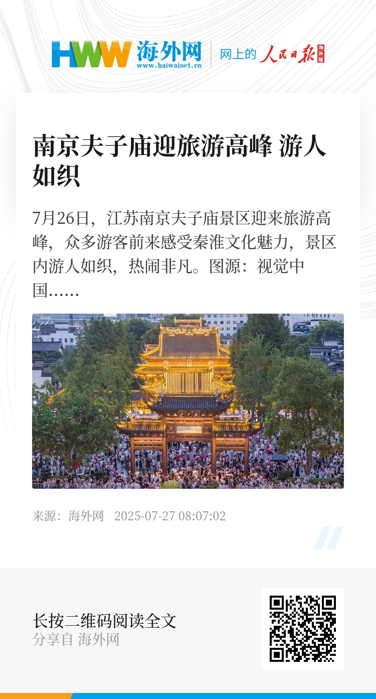 32881888,.南京夫子庙迎旅游高峰 游人如织,.2025-07-27 08:33:02,.204428,.张青津、卢思宇