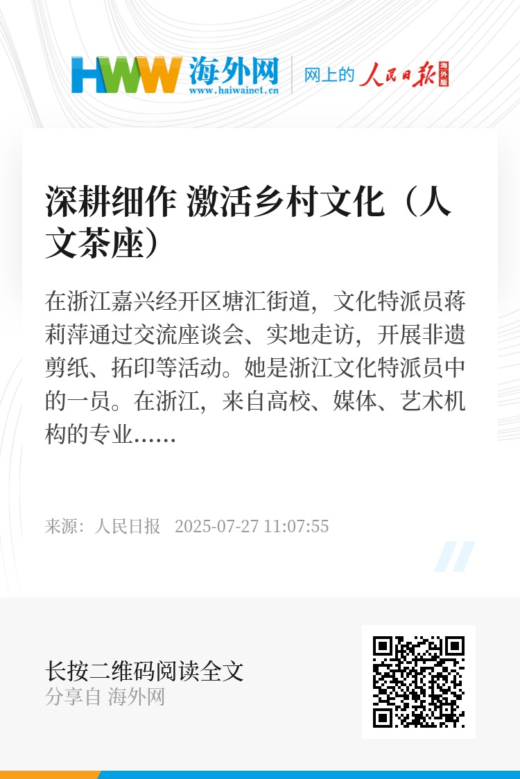在浙江嘉兴经开区塘汇街道,文化特派员蒋莉萍通过交流座谈会、实地走访,开展非遗剪纸、拓印等活动。她是浙江文化特派员中的一员。在浙江,来自高校、媒体、艺术机构的专业人才作为文化特派员,如今已举办万余场文化活动,组建上千支村民文艺队伍。在广阔乡村,一场以文化滋养乡土、赋能乡村振兴的实践,正在蓬勃展开。