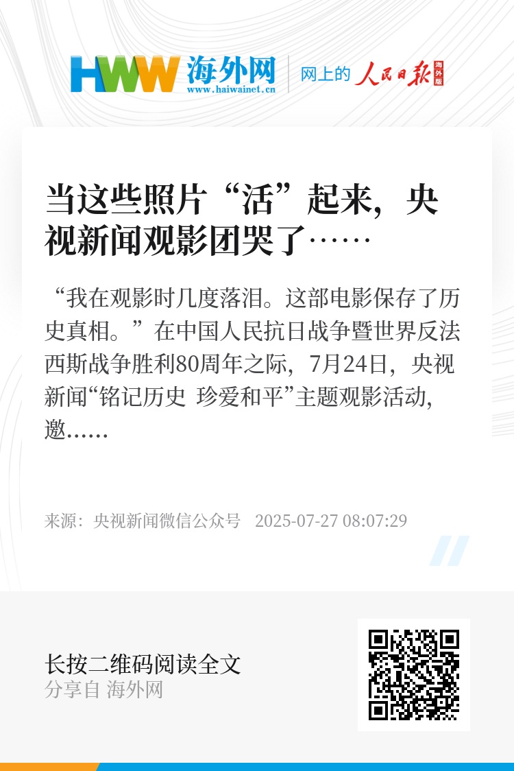 在中国人民抗日战争暨世界反法西斯战争胜利80周年之际,7月24日,央视新闻“铭记历史 珍爱和平”主题观影活动,邀请广大网友参加电影《南京照相馆》首映礼。
