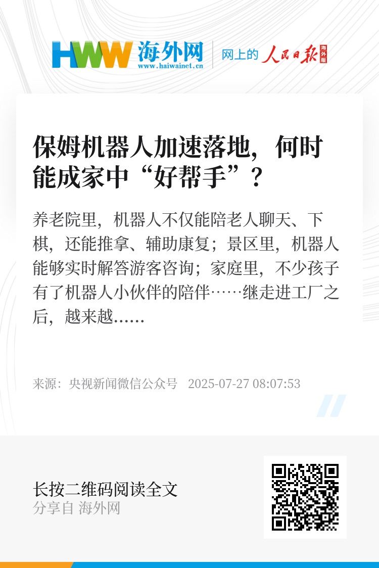 在政策、技术与市场需求的多重驱动下,目前,中国保姆机器人产业正在快速发展,开拓产业新蓝海。而各有所长的保姆机器人也在加速走进人们生活,为美好生活助力。