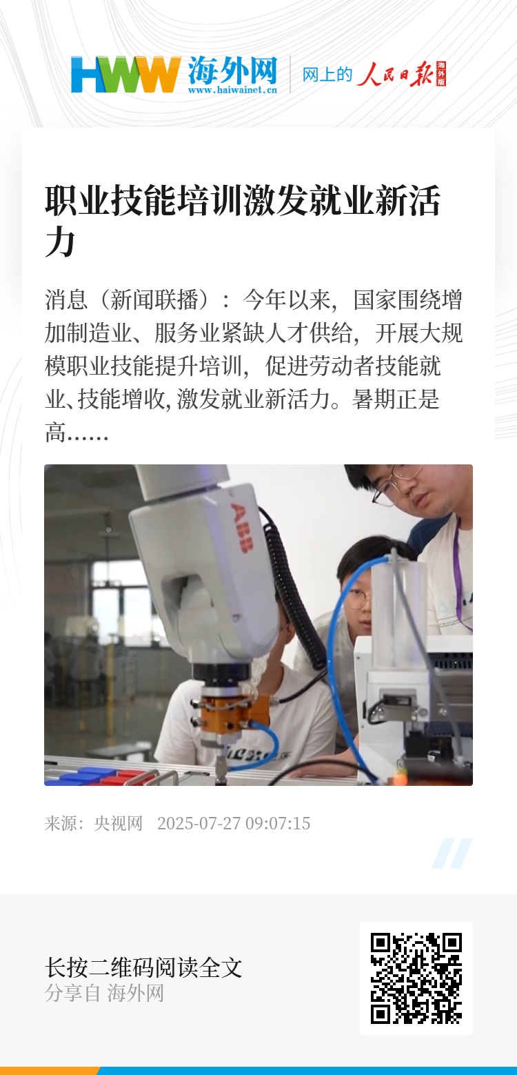 央视网消息(新闻联播):今年以来,国家围绕增加制造业、服务业紧缺人才供给,开展大规模职业技能提升培训,促进劳动者技能就业、技能增收,激发就业新活力。