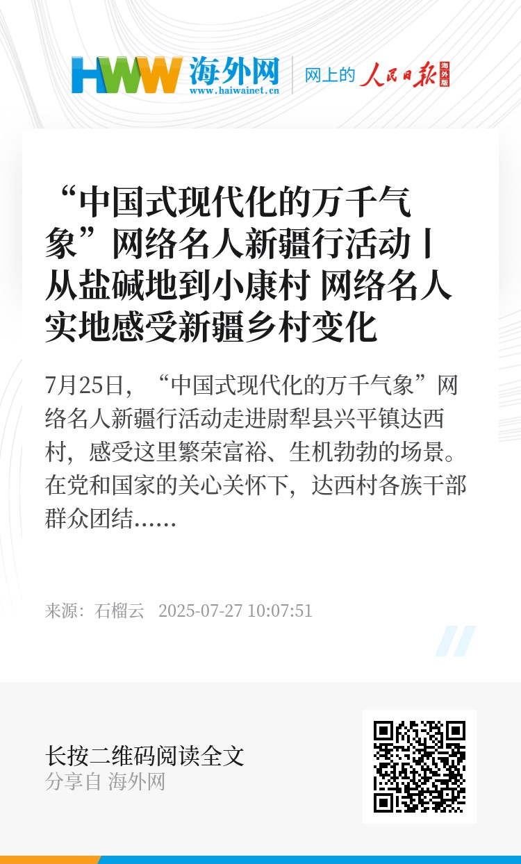 7月25日,“中国式现代化的万千气象”网络名人新疆行活动走进尉犁县兴平镇达西村,感受这里繁荣富裕、生机勃勃的场景。