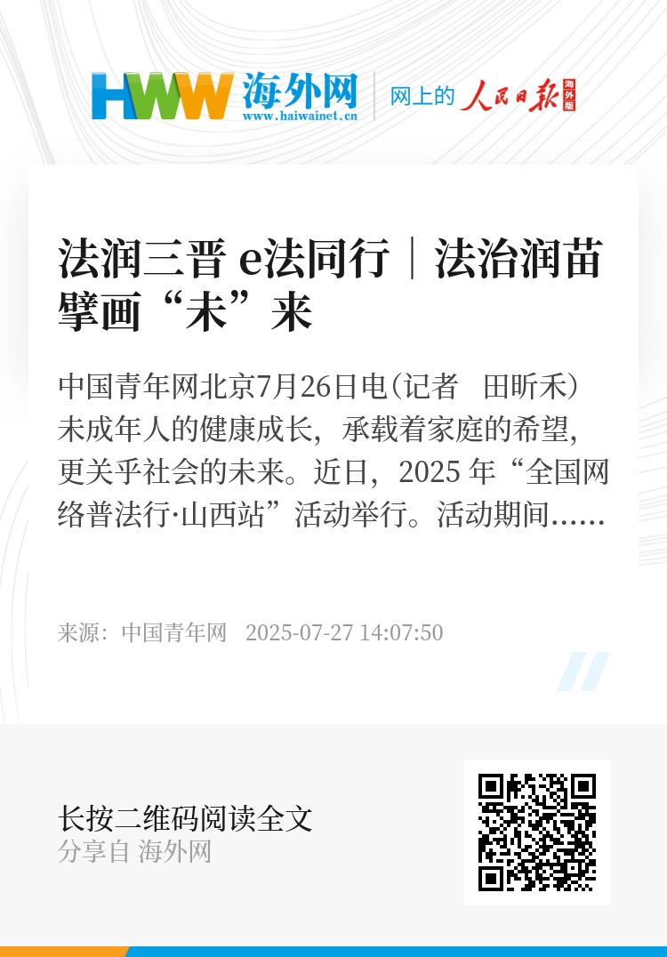 中国青年网北京7月26日电(记者 田昕禾)未成年人的健康成长,承载着家庭的希望,更关乎社会的未来。近日,2025 年“全国网络普法行·山西站”活动举行。活动期间,由中央和地方新闻网站组成的采访团深入探访,了解山西如何全力为未成年人的茁壮成长保驾护航,以及当地精心擘画的独具特色的未成年人保护“山西方案”。