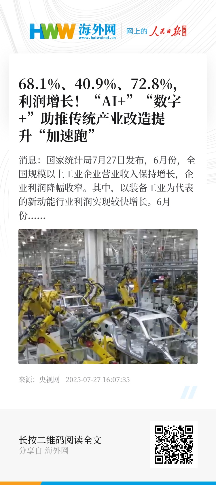 “两新”政策带动效果持续显现,6月份,智能无人飞行器制造和计算机整机制造行业利润同比分别增长160%和97.2%。