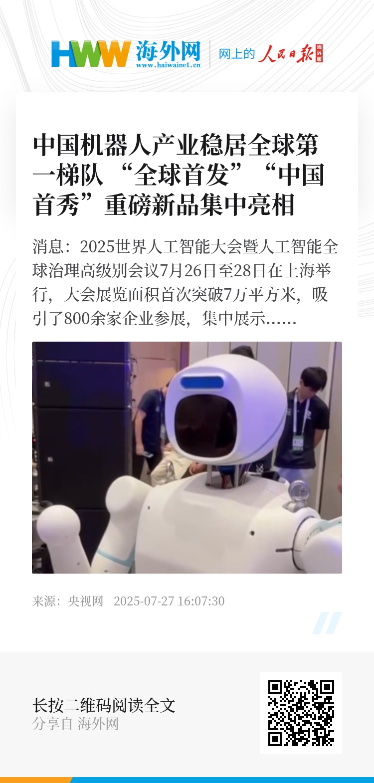 央视网消息:2025世界人工智能大会暨人工智能全球治理高级别会议7月26日至28日在上海举行,大会展览面积首次突破7万平方米,吸引了800余家企业参展,集中展示3000余项前沿展品及100余款“全球首发”“中国首秀”新品,规模创历届之最。